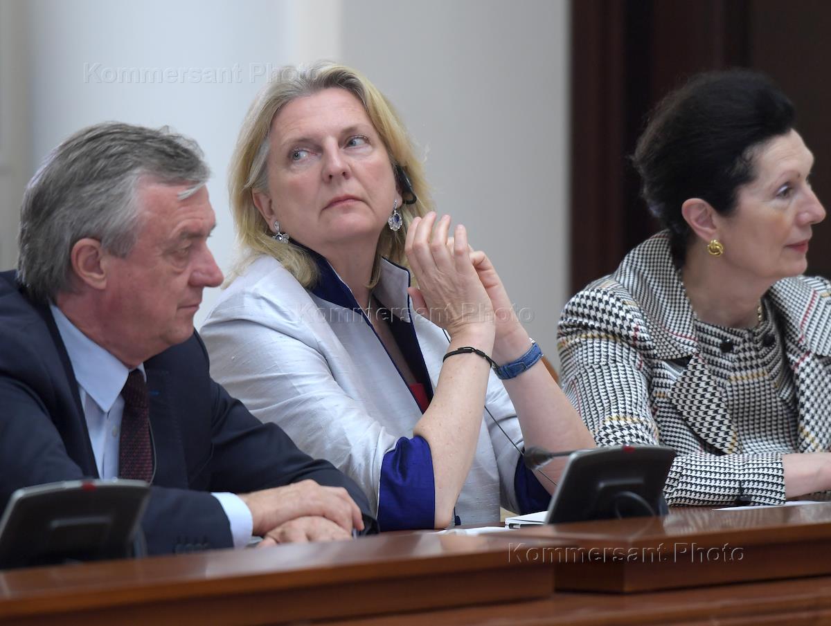 Рабочая поездка президента России Владимира Путина в Сочи. Министр иностранных дел Австрии Карин Кнайсль (в центре) во время учредительного заседания орума общественности "Сочинский диалог".