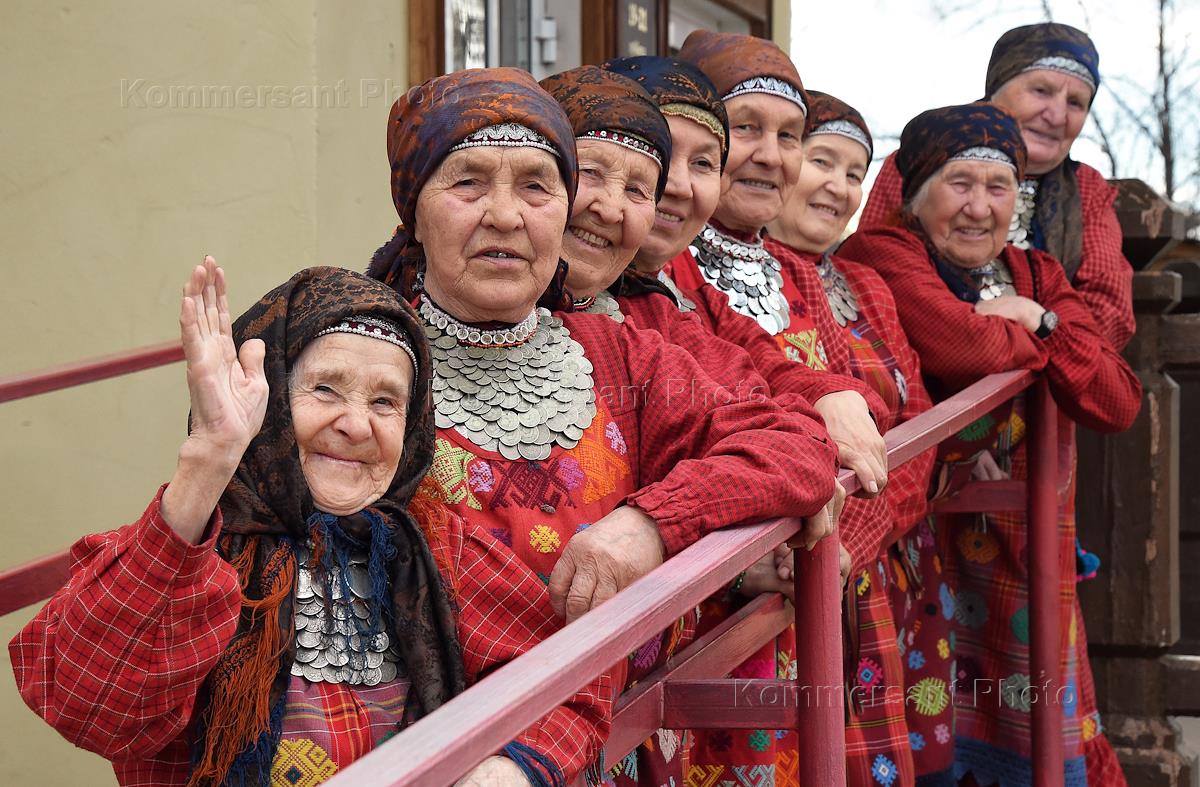 Члены российского музыкального фольклорного коллектива из села Бураново Малопургинского района Удмуртии "Бурановские бабушки" и "лицо" музыкального фольклорного коллектива Наталья Пугачева (в центре) во время фотографирования.