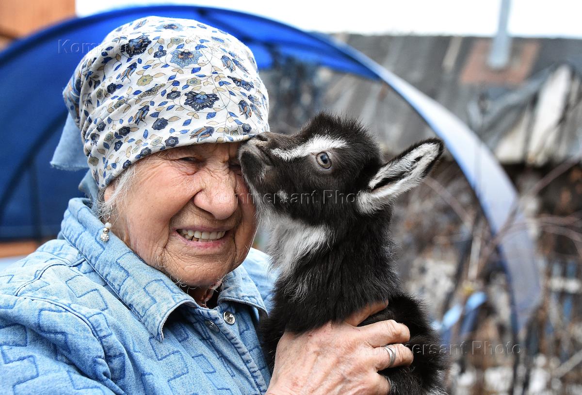 Член российского музыкального фольклорного коллектива из села Бураново Малопургинского района Удмуртии "Бурановские бабушки" Галина Конева с козленком во дворе своего дома.