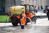 Жанровая фотография. Сотрудница коммунальной службы города поливки водой улицы.