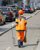 Жанровая фотография. Сотрудница коммунальной службы города во время уборки улицы.