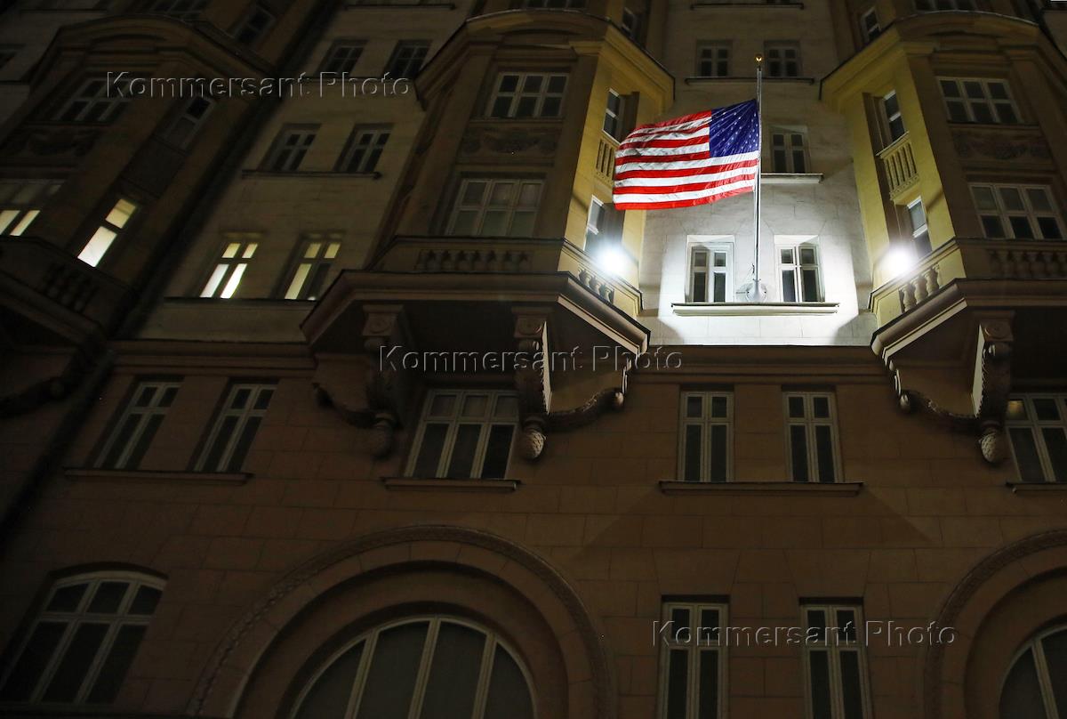 Жанровая фотография. Флаг Соединенных Штатов Америки на здании американского посольства на Новинском бульваре.