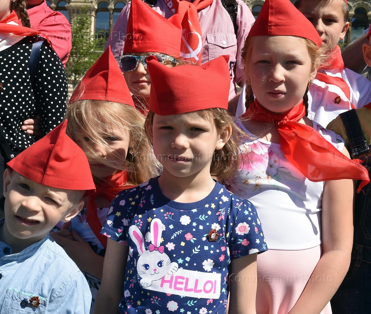 Торжественная церемония приема в пионеры на Красной площади. Лидер КПРФ, член комитета Государственной думы России по делам Содружества Независимых Государств, евразийской интеграции и связям с соотечественниками Геннадий Зюганов (слева) во время церемонии.