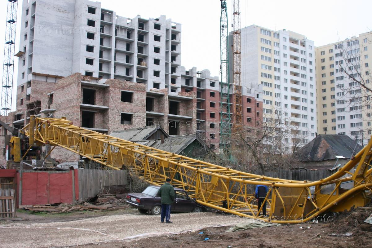 Башенный кран упал на жилые дома. В Железнодорожном районе Самары в результате падения 70 - метрового башенного крана КБ — 405 погибла 30 - летняя крановщица, раздавлены два автомобиля и частично разрушены два деревянных ветхих дома.