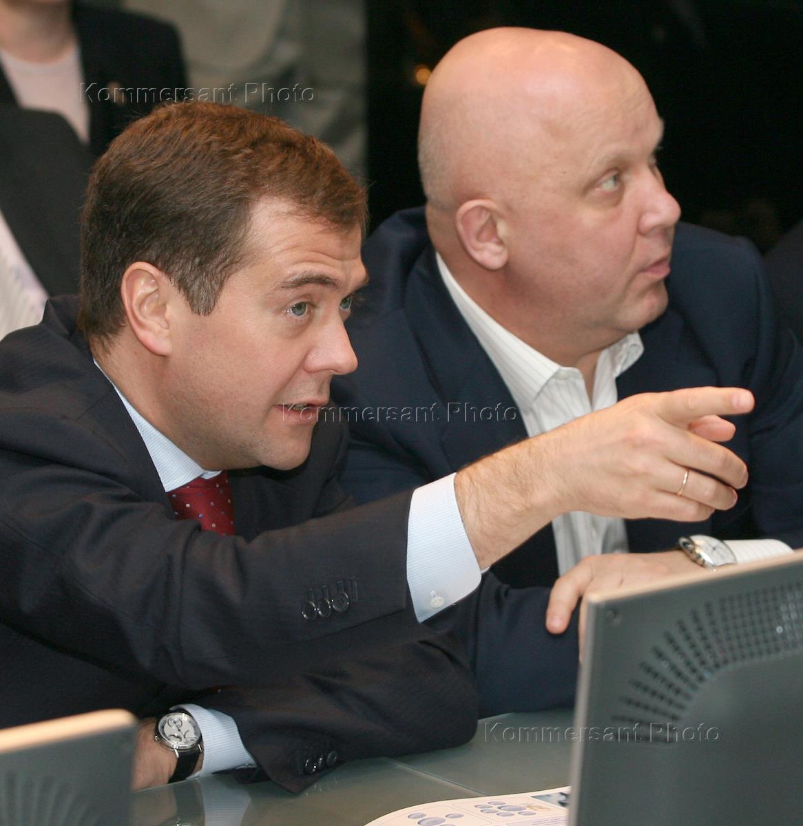 Первый заместитель председателя Правительства России Дмитрий Медведев (слева) во время посещения компании ОАО "SITRONICS" (Ситроникс).