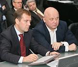 Первый заместитель председателя Правительства России Дмитрий Медведев (слева) и председатель совета директоров АФК "Система" Владимир Евтушенков (справа) во время посещения компании ОАО "SITRONICS" (Ситроникс).