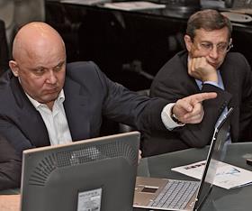 Председатель совета директоров АФК "Система" Владимир Евтушенков (справа) и вице-президент АФК "Система" Александр Гончарук (слева) во время посещения компании ОАО "SITRONICS" (Ситроникс).