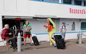Северный речной вокзал. Посадка пассажиров на круизный теплоход "Георгий Жуков" компании "Водоходъ" для путешествия по Волге.
