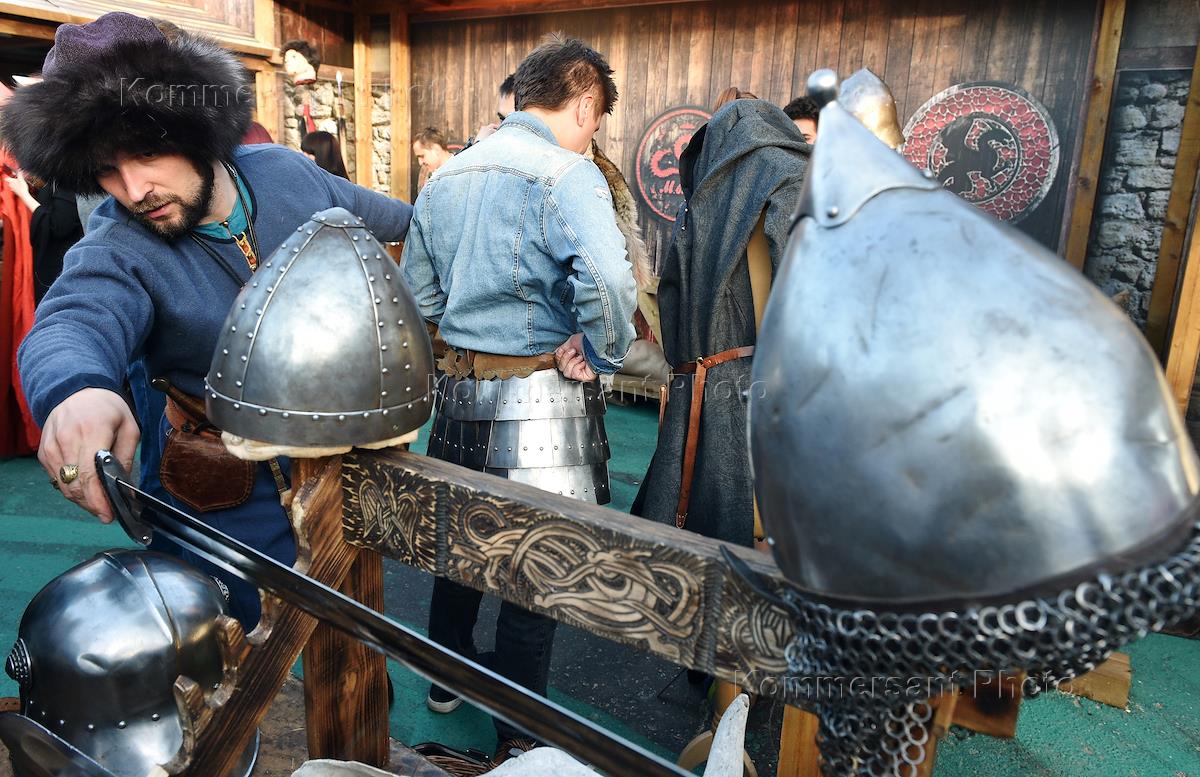 Участники театрализованного представления на просмотре последней серии финального сезона сериала "Игра Престолов" на стадионе "РЖД Арена".