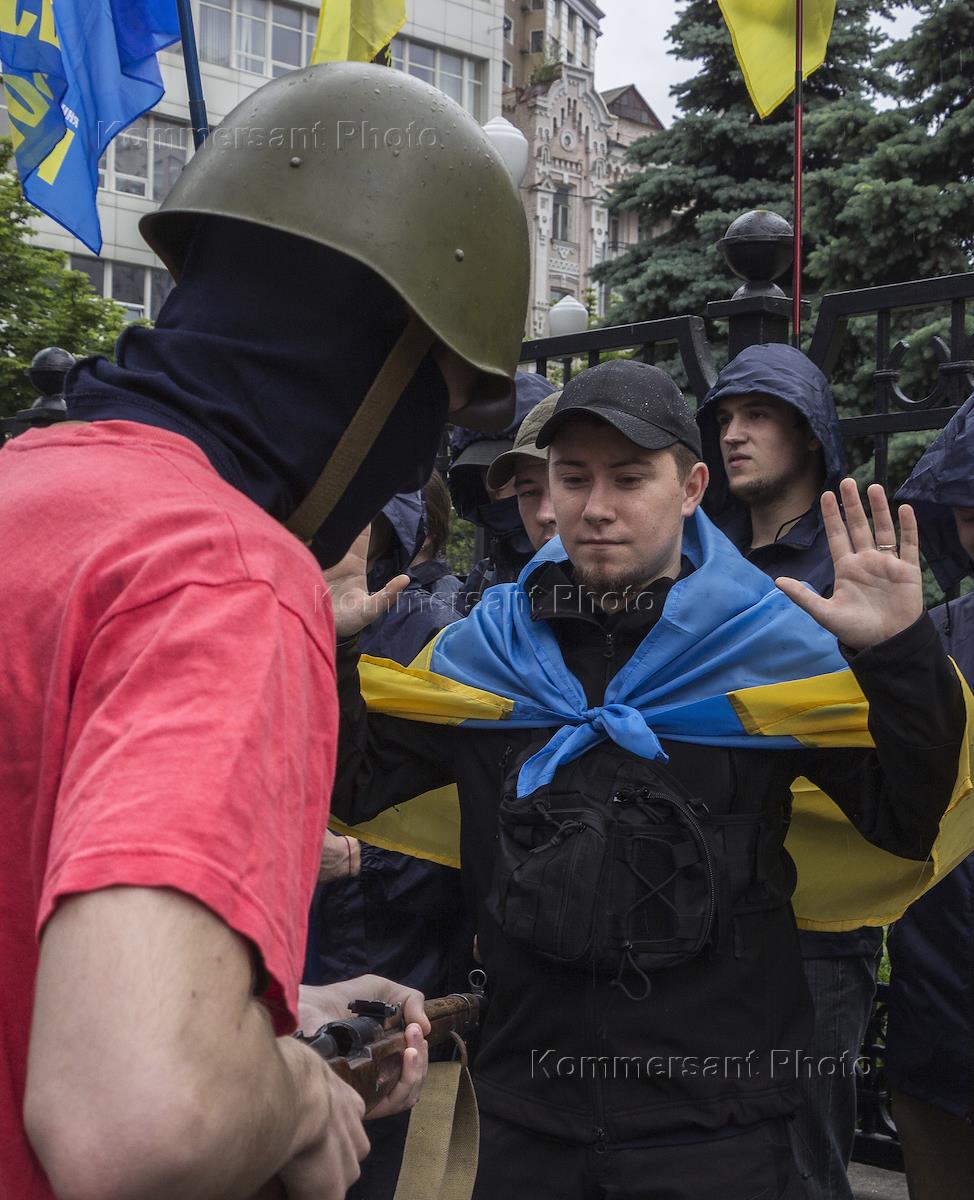 Активисты инициативы "Защити Украину" пикетируют здание Конституционного суда Украины. Их требование - не допустить отмену декоммунизации Украины. Представитель партии "Свобода" Игорь Мирошниченко во время пикетирования.