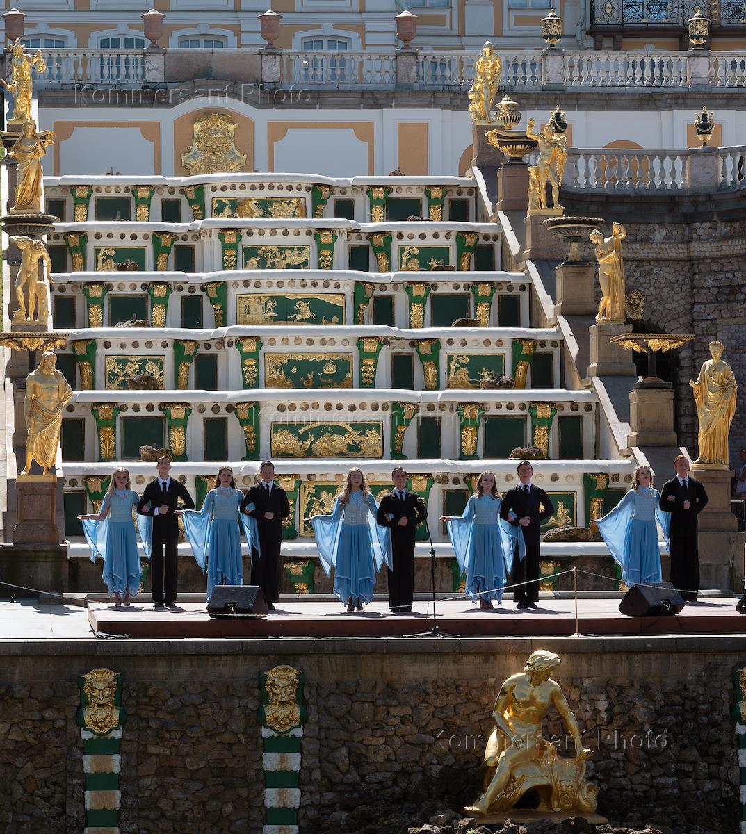 Церемония открытия фонтанов прошла в Нижнем парке Петергофа. Участники концертной программы во время церемонии.