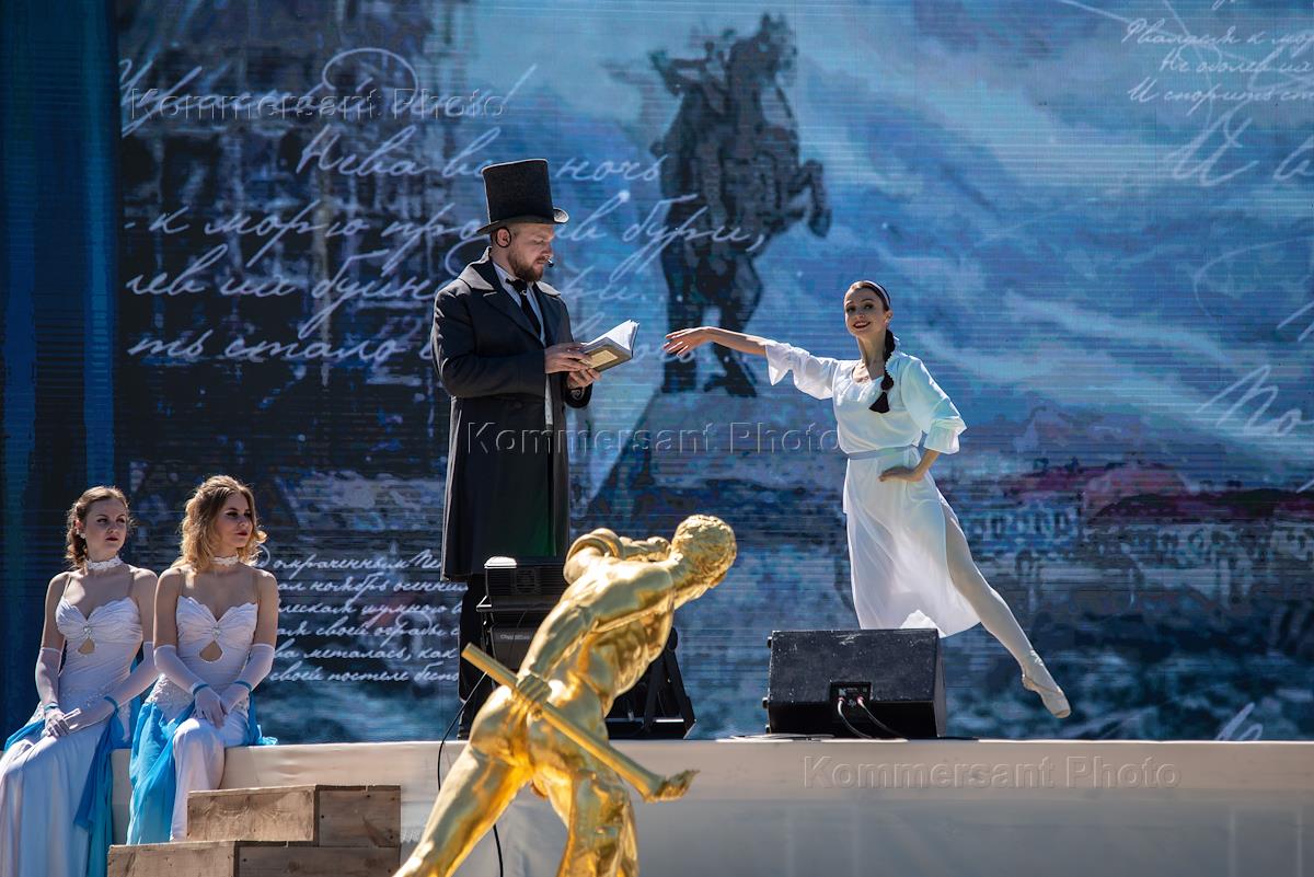 Церемония открытия фонтанов прошла в Нижнем парке Петергофа. Участники концертной программы во время церемонии.