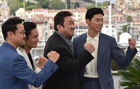 72-й Каннский международный кинофестиваль 2019 / Festival de Cannes 2019. День десятый. Слева направо: режиссер Ли Вон-тхэ, актеры Ким Сон Гю, Ма Дон-сок и Ким Му-ёль во время фотосессии фильма "Бандит, полицейский, дьявол" (The Gangster, The Cop, The Devil) режиссера Ли Вон-тхэ.