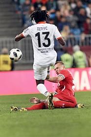 Кубок России по футболу "Олимп". Финал. Матч между командами "Локомотив" (Москва) и "Урал" (Екатеринбург) на стадионе "Самара Арена". Игрок команды "Урал" Петрус (слева) и игрок команды "Локомотив" Дмитрий Тарасов (справа) во время матча.