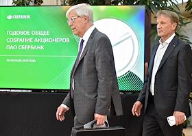 Председатель правления Сбербанка России Герман Греф (справа) и председатель наблюдательного совета Сбербанка России Сергей Игнатьев (слева) перед началом пресс-конференции по итогам годового общего собрания акционеров ПАО "Сбербанк".