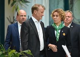 Председатель правления Сбербанка России Герман Греф (второй слева) перед началом пресс-конференции по итогам годового общего собрания акционеров ПАО "Сбербанк".