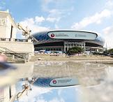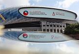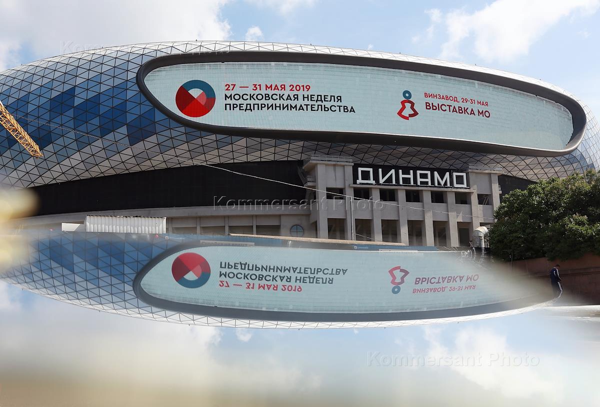 Виды Москвы. Стадион "Динамо" в Петровском парке. Вывеска на здании стадиона "27-31 мая 2019 года Московская неделя предпринимательства".