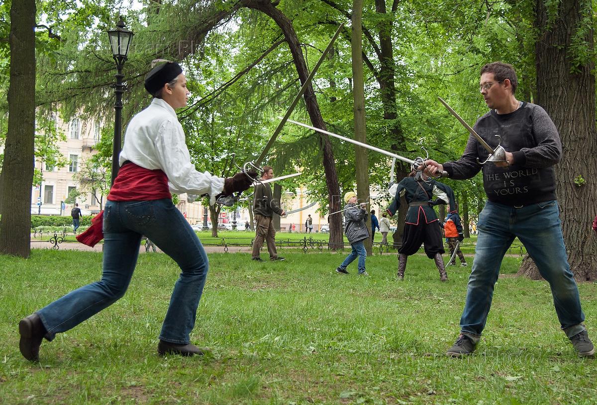Празднование Дня города. Участники праздника фехтования, приуроченного к празднованию Дня города, в Александровском парке.