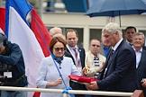 Церемония спуска на воду атомного ледокола класса ЛК-60Я (проект 22220) "Урал" прошла на Балтийском судостроительном заводе. Председатель Центрального Банка России Эльвира Набиуллина (в центре) во время церемонии.
