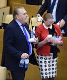 Пленарноое заседание Государственной думы (ГД) России. Член комитета ГД России по по делам Содружества Независимых Государств, евразийской интеграции и связям с соотечественника Юрий Мищеряков (слева) и член комитета ГД России по вопросам семьи, женщин и детей Валентина Рудченко перед началом заседания.