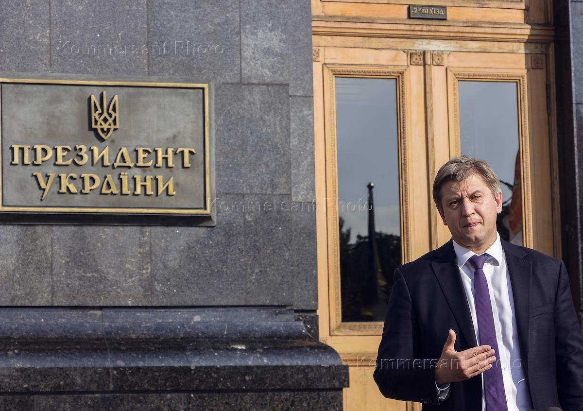 Секретарь Совета национальной безопасности и обороны Украины Александр Данилюк во время брифинга у здания администрации президента Украины.