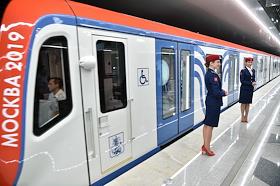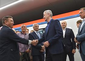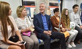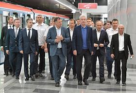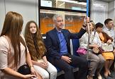 Церемония открытия станции метро "Некрасовка" и движения на участке от станции метро "Косино" до станции "Некрасовка" Некрасовской линии Московского метрополитена. Мэр Москвы Сергей Собянин (в центре) в вагоне поезда метро.
