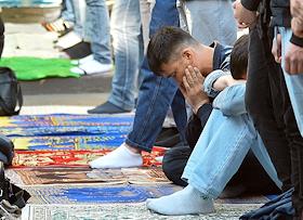 Мусульманский праздник Ураза-Байрам. Верующие во время намаза у Исторической мечети.