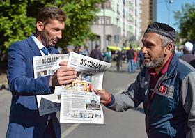 Мусульманский праздник Ураза-Байрам. Распространитель газеты "Ас салам" возле Исторической мечети.