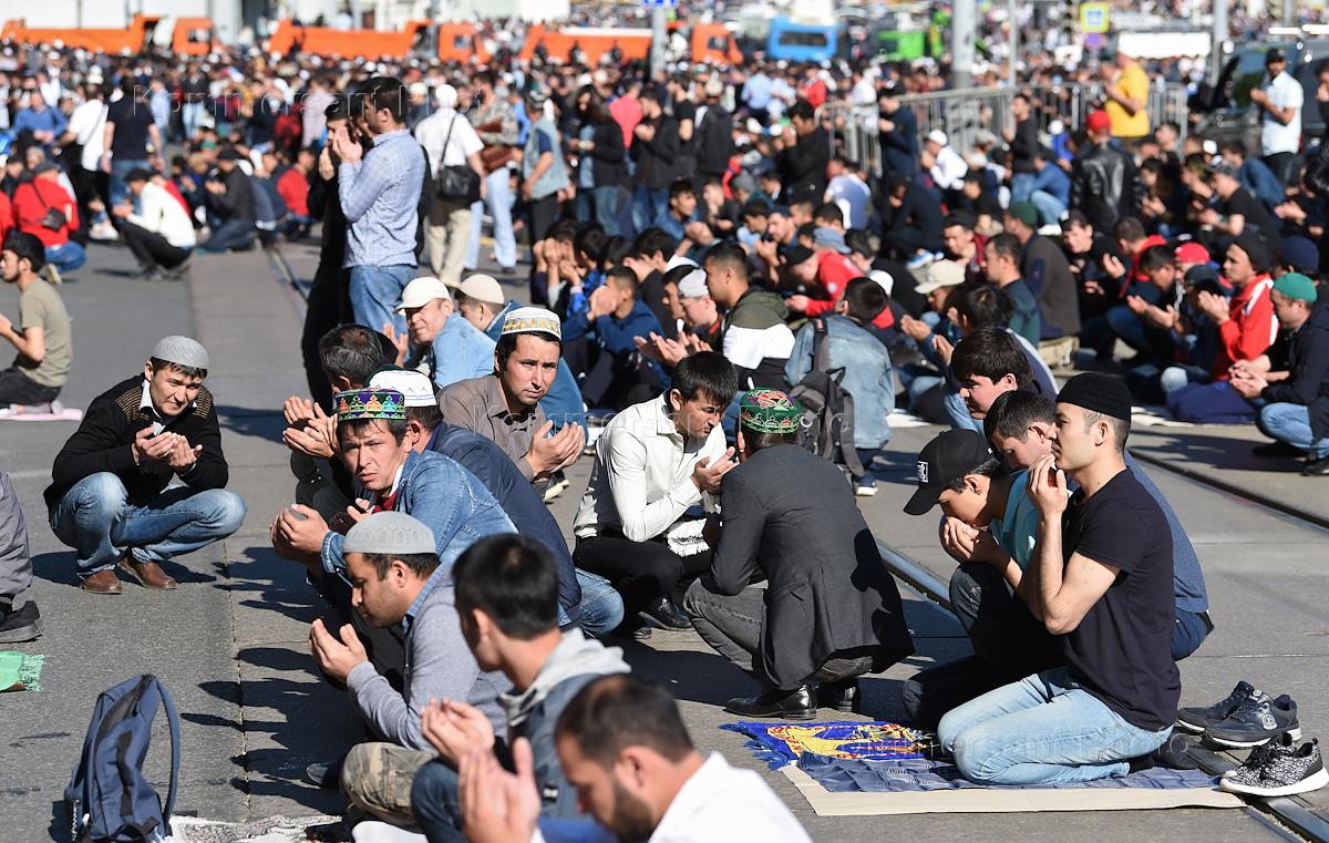 Мусульманский праздник Ураза-Байрам. Верующие во время намаза у Московской Соборной мечети.