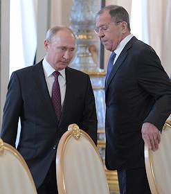 Президент России Владимир Путин (слева) и министр иностранных дел России Сергей Лавров (справа) перед началом переговоров с председателем КНР Си Цзиньпином. Переговоры прошли в Кремле.