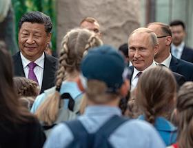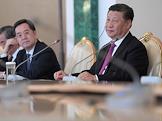 Президент России Владимир Путин (второй слева) и председатель КНР Си Цзиньпин (третий справа) перед началом переговоров в Кремле.