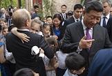 Председатель КНР Си Цзиньпин (справа) и президент России Владимир Путин ( слева) во время посещения Московского зоопарка, где открылся павильон панд.