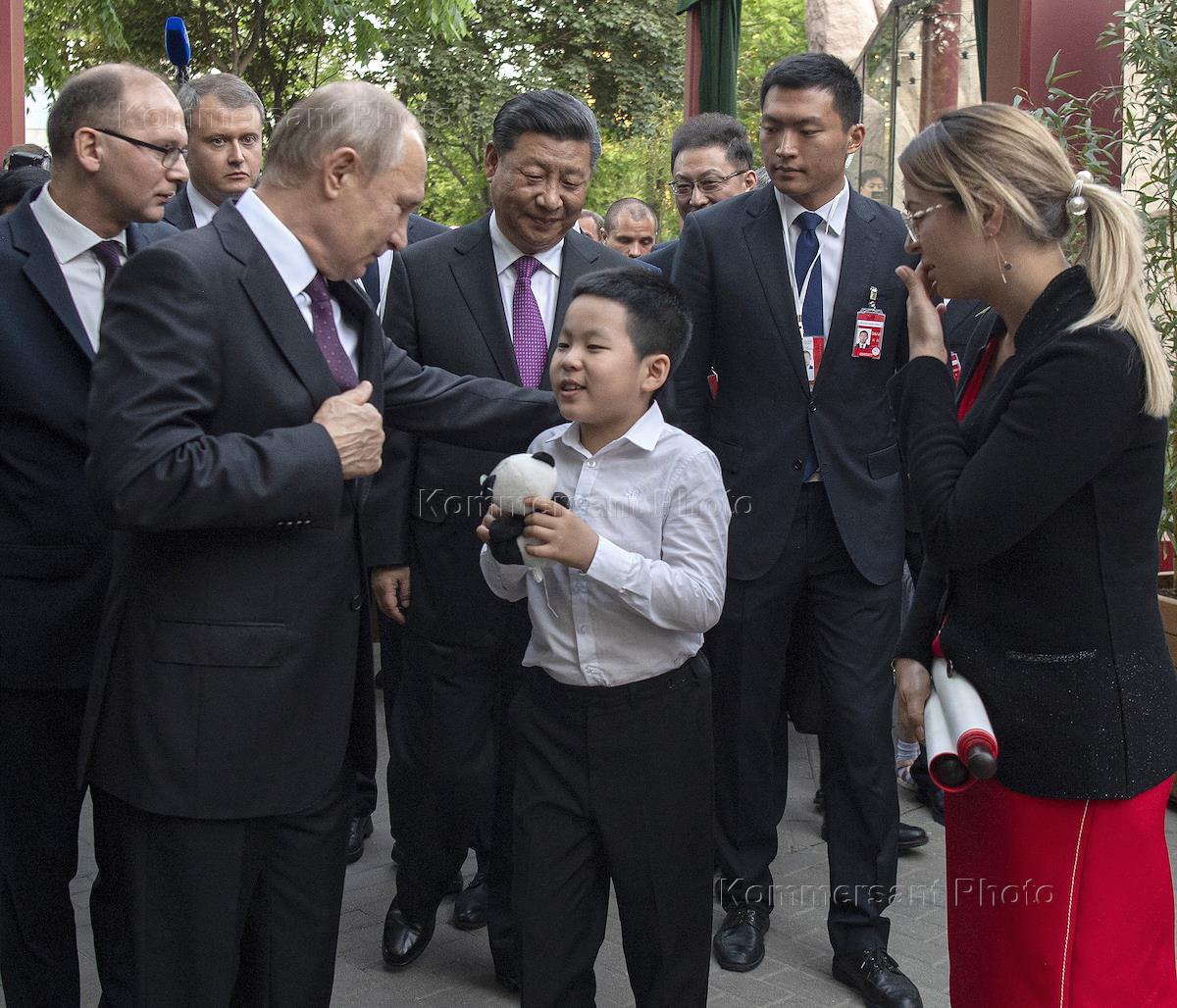 Председатель КНР Си Цзиньпин (в центре) и президент России Владимир Путин (третий слева) во время посещения Московского зоопарка, где открылся павильон панд.