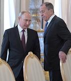 Президент России Владимир Путин (слева) и министр иностранных дел России Сергей Лавров (справа) перед началом переговоров с председателем КНР Си Цзиньпином. Переговоры прошли в Кремле.