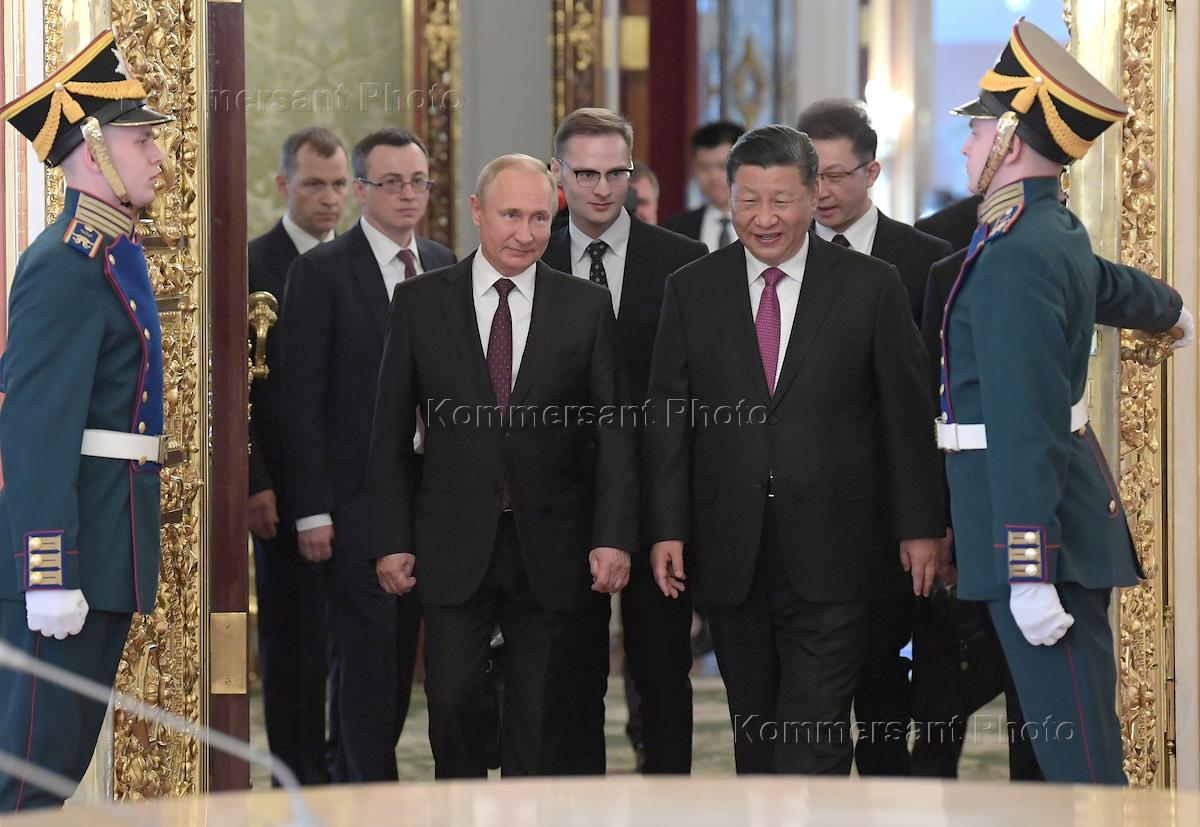 Председатель КНР Си Цзиньпин (справа) во время переговоров с президентом России Владимиром Путиным в Кремле.