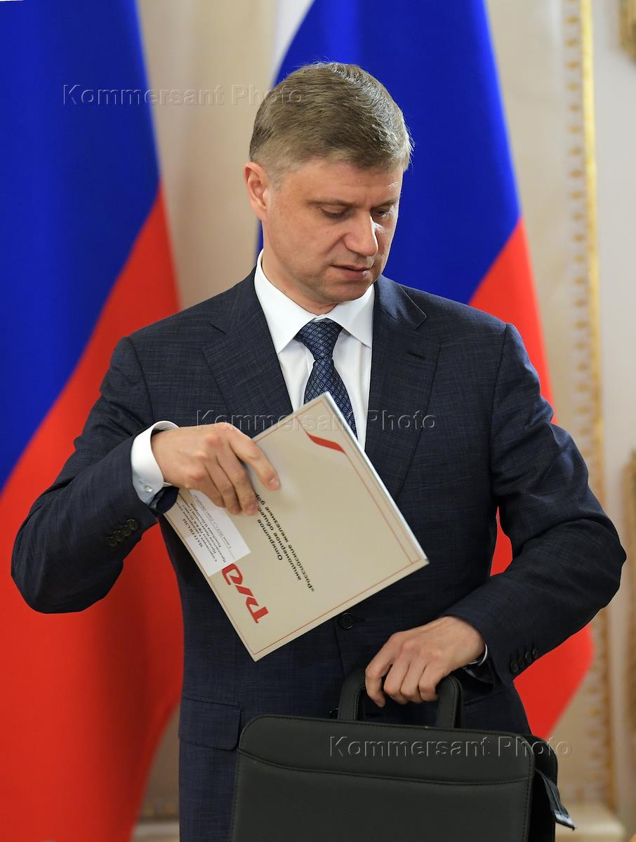 Рабочая поездка президента России Владимира Путина в Санкт-Петербург. XXIII Петербургский международный экономический форум. Президент – председатель правления Банка ВТБ Андрей Костин (слева) и министр транспорта России Евгений Дитрих (справа) перед началом встречи президента России Владимира Путина и премьер-министра Армении Николы Пашиняна в рамках форума.