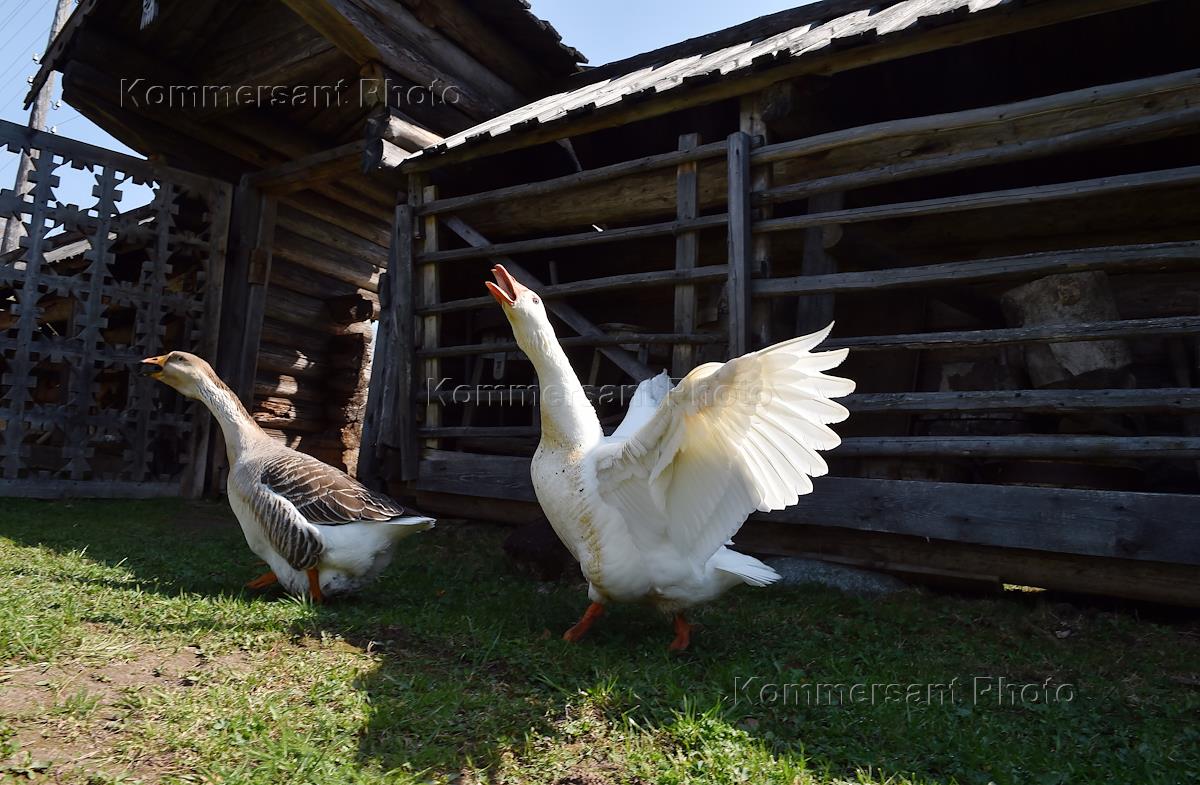 Учемский музей истории Касиановой Пустыни и судьбы русской деревни. Гуси перед старым домом.