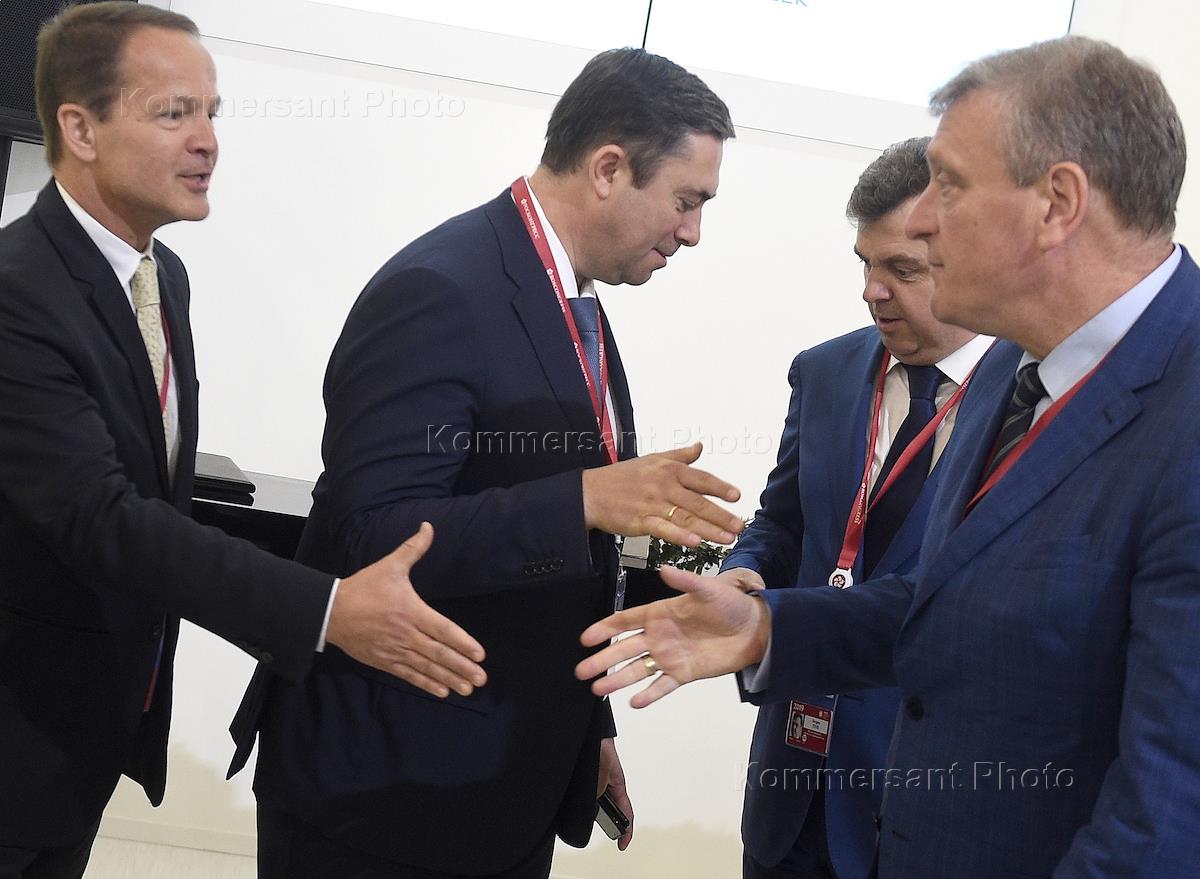 The XXIII St. Petersburg International Economic Forum (SPIEF) 2019 was held at the Expoforum Convention and Exhibition Center. Day two. The ceremony of signing a memorandum between MSD Animal Health and the NANOLEK company with intention to localize the production of vaccines in the veterinary market of Russia. NANOLEK President Vladimir Khristenko (left), Deputy Minister of Agriculture of Russia Maxim Uvaydov (third right), First Deputy Minister of Industry and Trade of Russia Sergey Tsyb (second right) and Kirov Region Governor Igor Vasilyev (right) at the ceremony.