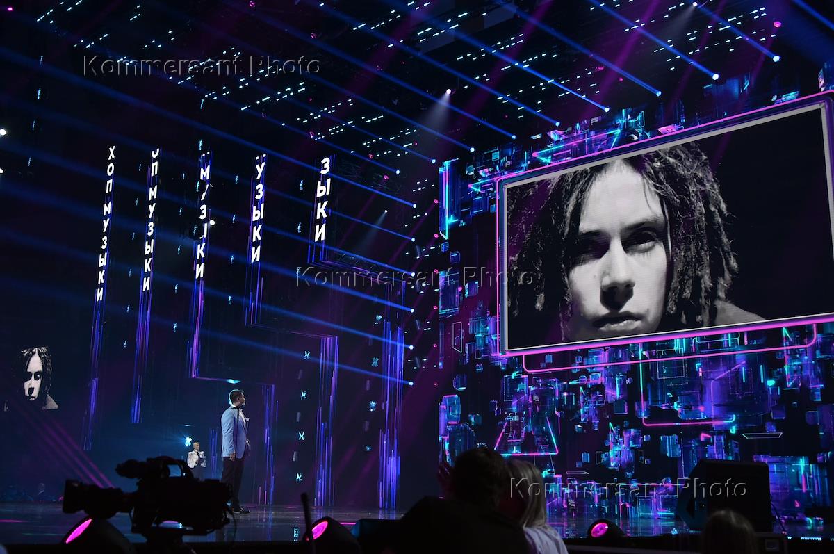 XVII Ежегодная национальная телевизионная премия в области популярной музыки телеканала "МУЗ-ТВ" "Премия МУЗ-ТВ 2019. Музыка объединяет!" во Дворце спорта "Мегаспорт". Рэпер Децл (Кирилл Толмацкий) - фото на экране - посмертно удостоился премии "Муз-ТВ" "За вклад в развитие хип-хоп-музыки".