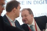 ХХIII Петербургский международный экономический форум (ПМЭФ) 2019. День третий. Специальный представитель президента РФ по вопросам цифрового и технологического развития Дмитрий Песков (справа) и министр правительства Москвы, руководитель Департамента информационных технологий города Москвы Эдуард Лысенко (второй справа) во время сессии "Данные на службе государства и общества: траектории будущего".
