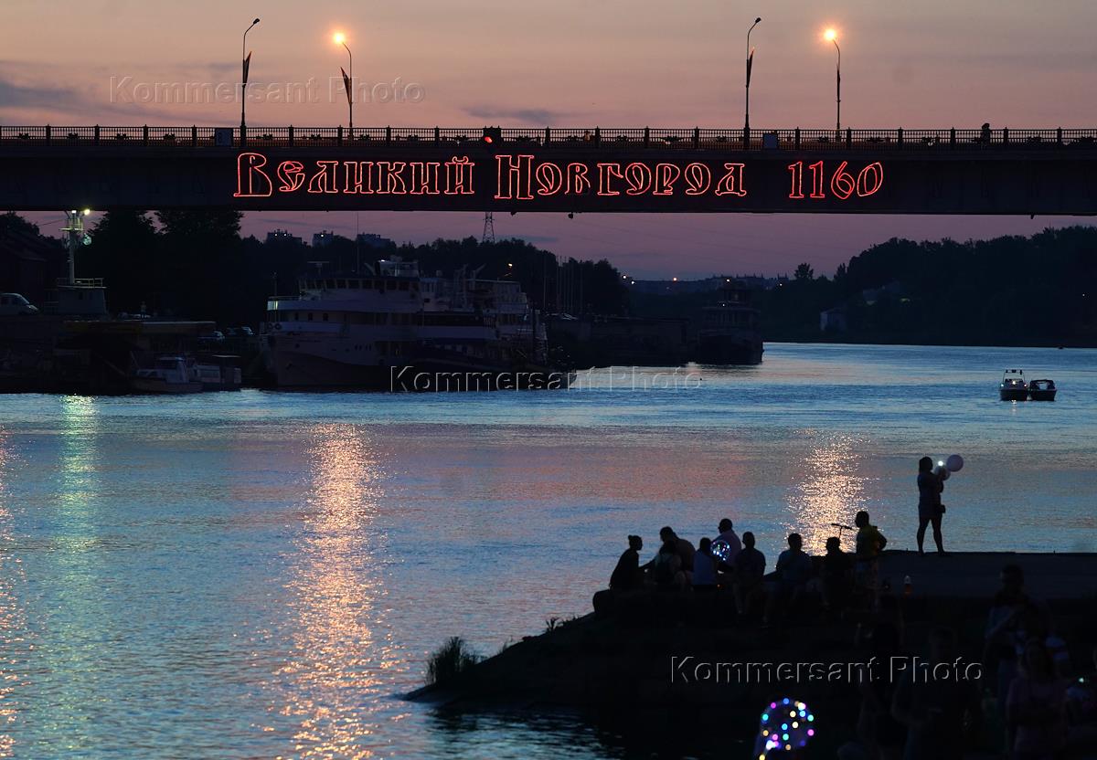 Праздничные мероприятия, посвященные 1160-летию Великого Новгорода. Надпись на мосту через реку "Великий Новгород 1160".