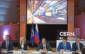 Рабочая поездка председателя правительства России Дмитрия Медведева в Женеву. Встреча председателя правительства России Дмитрия Медведева с российскими учеными, участвующими в экспериментах ЦЕРН в Европейской организации по ядерным исследованиям (ЦЕРН). Председатель правительства России Дмитрий Медведев во время встречи.