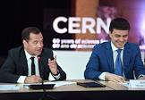 Рабочая поездка председателя правительства России Дмитрия Медведева в Женеву. Встреча председателя правительства России Дмитрия Медведева с российскими учеными, участвующими в экспериментах ЦЕРН в Европейской организации по ядерным исследованиям (ЦЕРН). Председатель правительства России Дмитрий Медведев (слева) и министр науки и высшего образования России Михаил Котюков (справа) во время встречи.