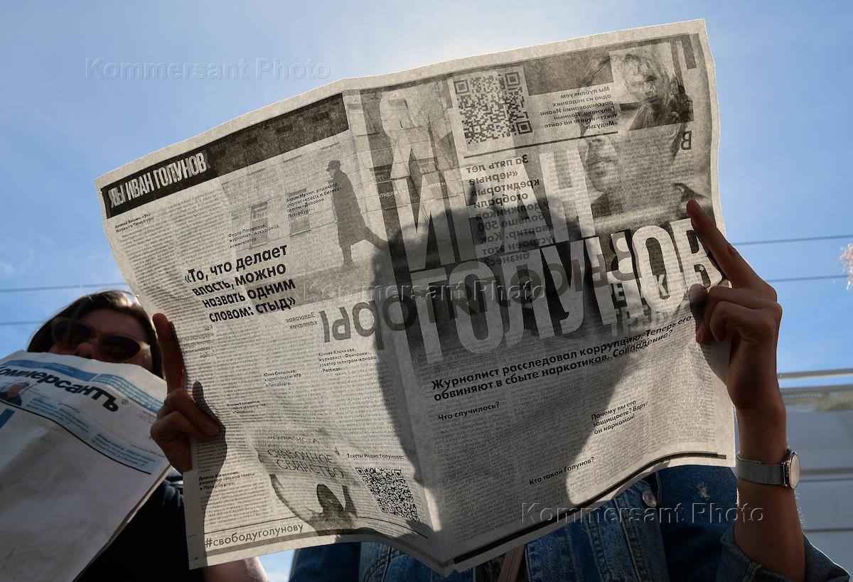 Акция журналистской солидарности с журналистом "Медузы" Иваном Голуновым. Участники акции на площади Восстания