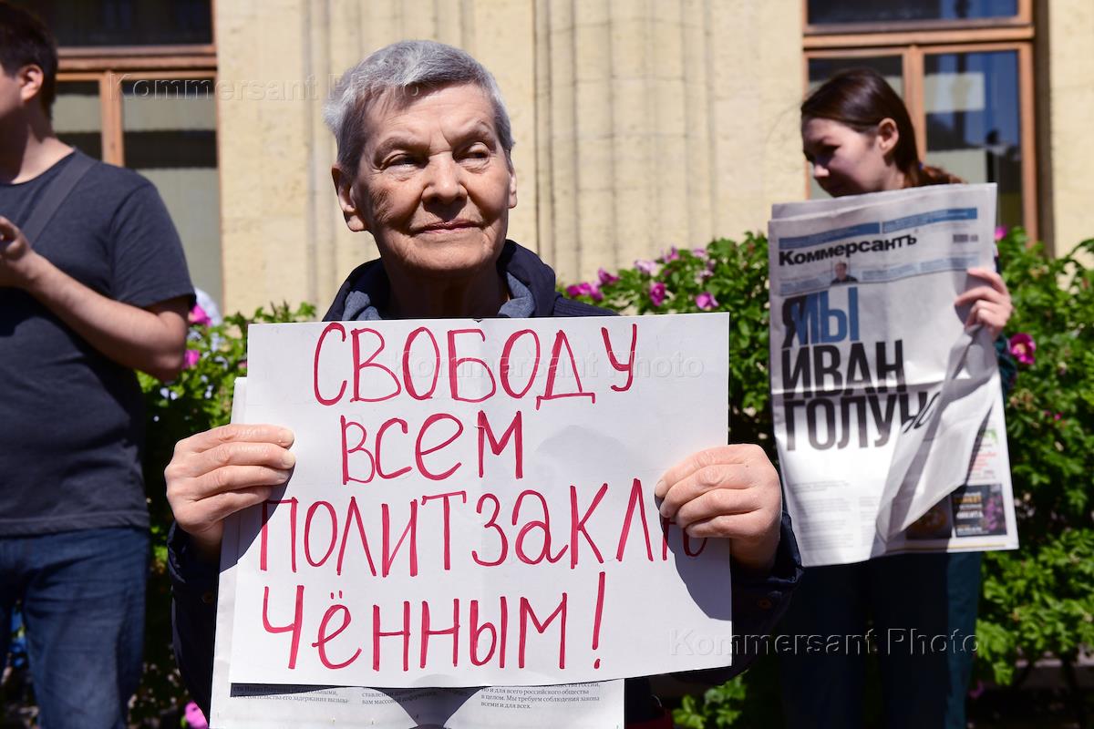 Акция журналистской солидарности с журналистом "Медузы" Иваном Голуновым на площади Восстания. Кандидат в муниципальные депутаты МО "Смольнинское", координатор (глава) штаба Алексея Навального в Санкт-Петербурге Ирина Фатьянова (в центре) во время акции.