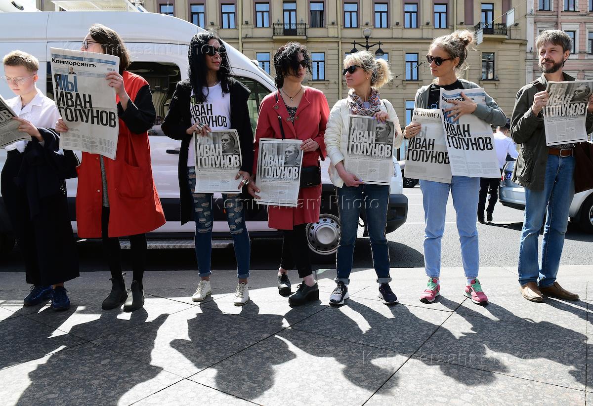 Акция журналистской солидарности с журналистом "Медузы" Иваном Голуновым. Участники акции на площади Восстания