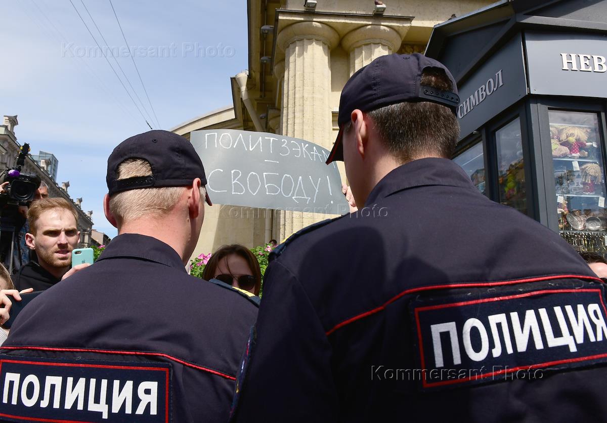 The rally to support Medusa's journalist Ivan Golunov. Participants of the rally and police officers on Vosstaniya Square.
