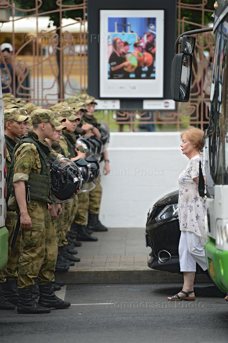 Марш в поддержку журналиста издания "Медуза" Ивана Голунова, против которого возбудили уголовное дело о сбыте наркотиков. Сотрудники Росгвардии во время дежурства на марше на Чистых прудах.