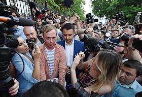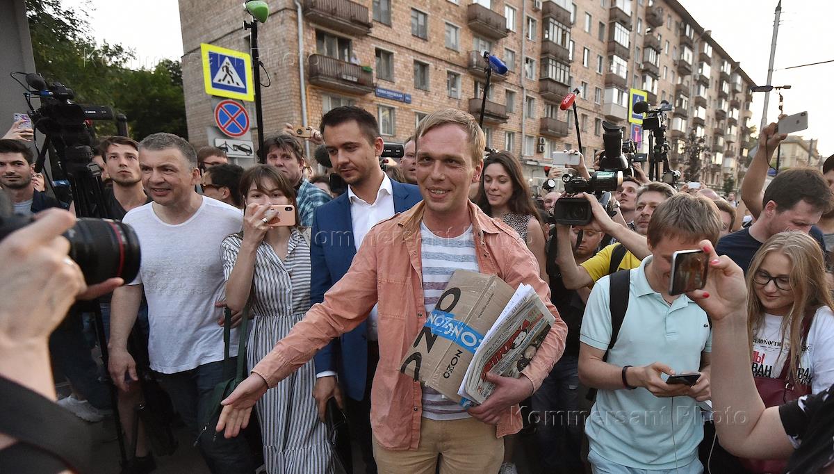 Корреспондент интернет-издания "Медуза" Иван Голунов (в центре) во время выхода из здания главного следственного управления МВД по Москве после снятия с него всех обвинений по делу о покушении на сбыт наркотических веществ.