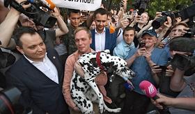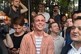 Корреспондент интернет-издания "Медуза" Иван Голунов (в центре) вышел из здания главного следственного управления МВД по Москве после снятия с него всех обвинений по делу о покушении на сбыт наркотических веществ.